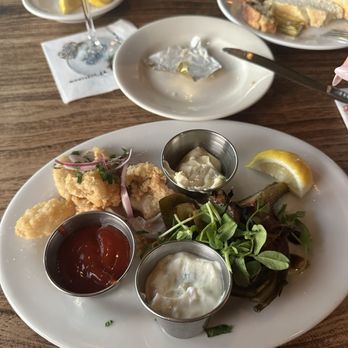 The food here is honestly amazing. The clam chowder was outstanding, the calamari was tasty. Everyone was kind and attentive and there was always someone around to tend to anything we needed. The restaurant is clean and music playing at just the right volume. Beautiful view and great, great food.